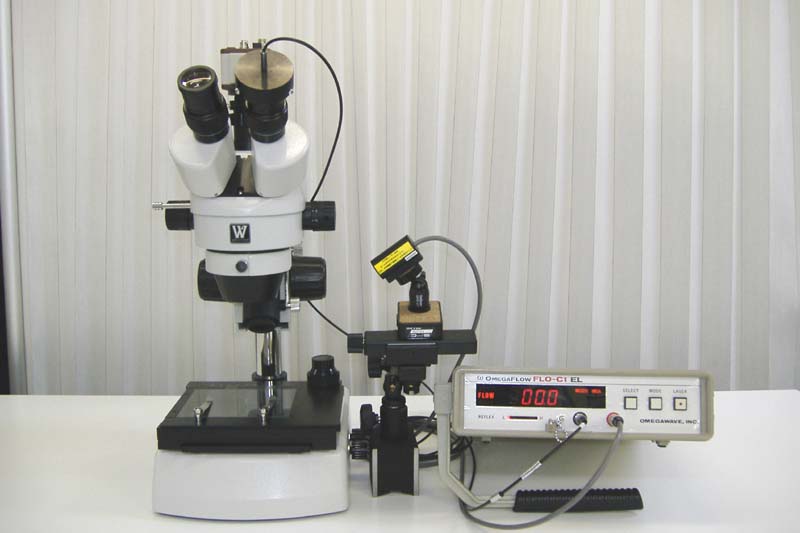 ・顕微鏡下組織測定用レーザー血流計、FLO-C1EL、は、顕微鏡下の生体組織を観測しながら血流を測定する装置です。 ・ラットの開腹時の内蔵などの生体組織を顕微鏡で観測しながら血流を測定できます。 ・レーザー光は顕微鏡の外から照射し、対物レンズを通じて光ファイバープローブで受光します。 ・受光した信号光は血流計本体にて演算処理され、血流量、血液量と血流速度が求められます。 ・プローブを生体組織に接触させる必要がないので、プローブ接触による影響がなく、また入り組んだ場所の測定も可能です。 ・測定対象の場所に合わせて照射点の大きさも可変できます。また、プローブ先端には外光を受光しないように光学フィルターが設置されています。 ・顕微鏡の鏡筒に合わせたアタッチメントにより、いろいろな顕微鏡で用いることが可能です。 | |